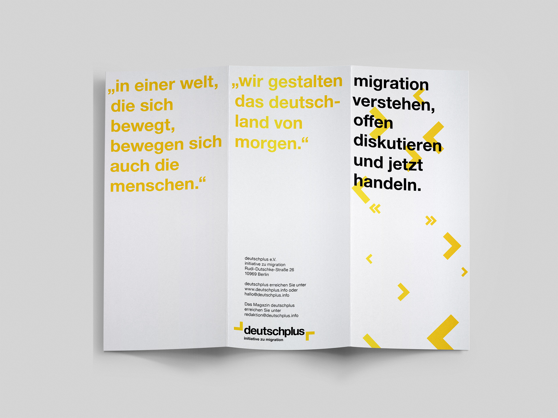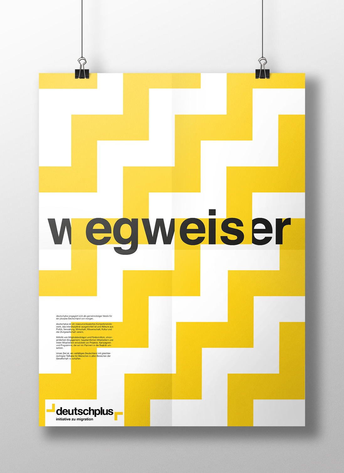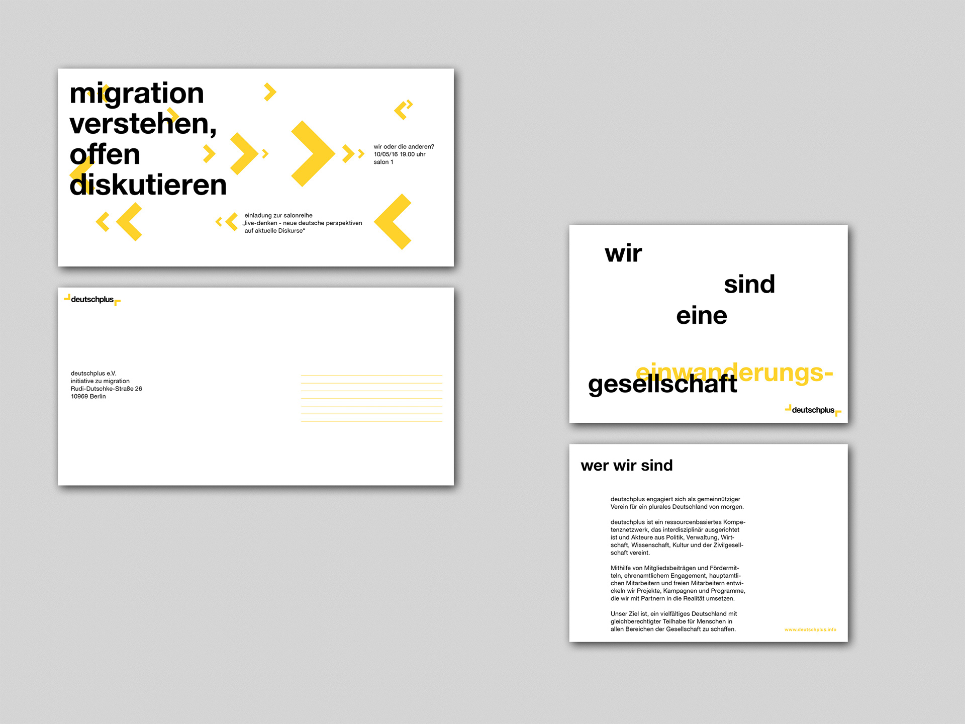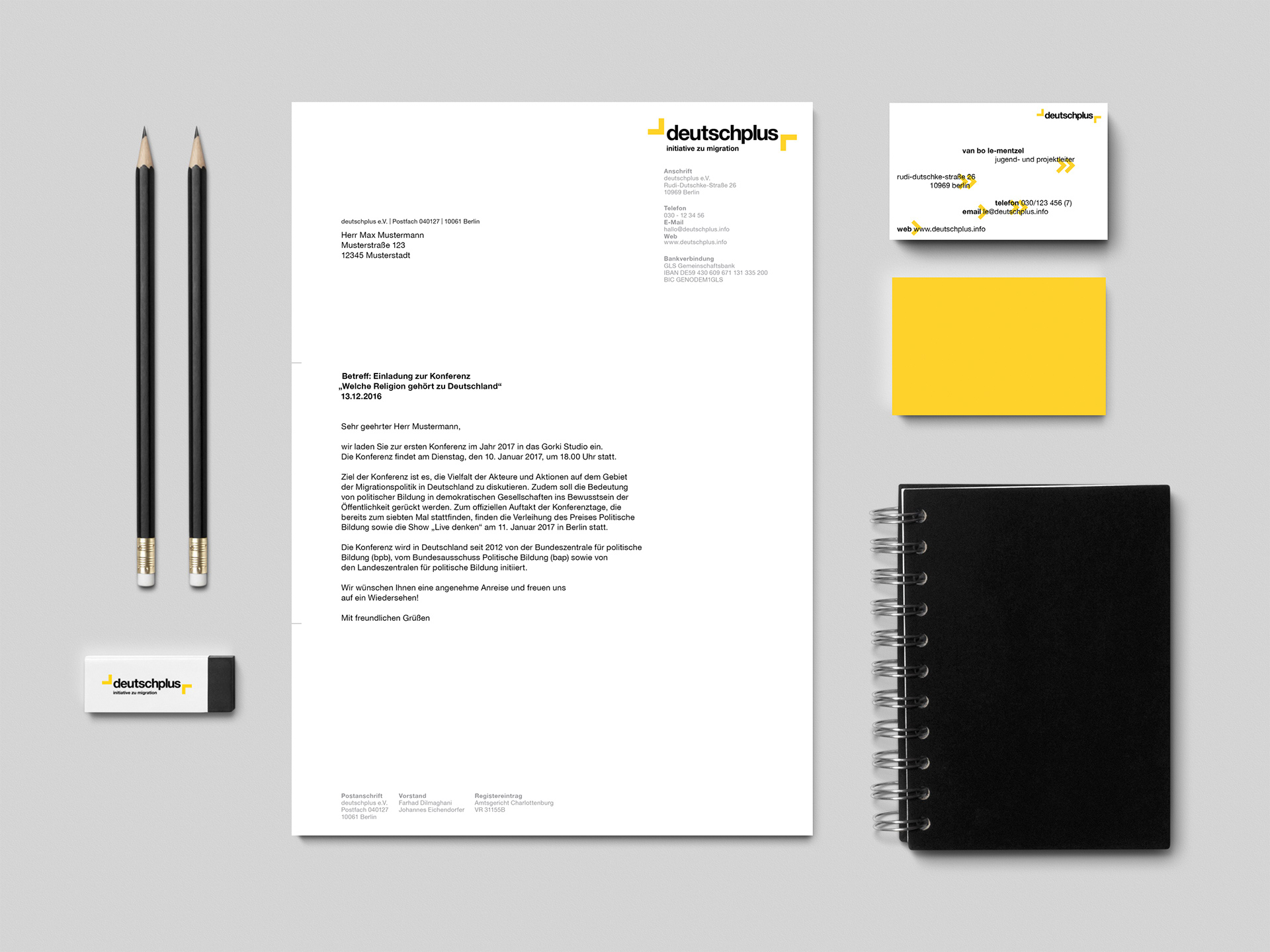 The project is part of the Bachelor program. The initiative DeutschPlus e.V. is a non-profit organization in Berlin. They mainly deal with migration topics. This project shows the realization of a corporate identity.